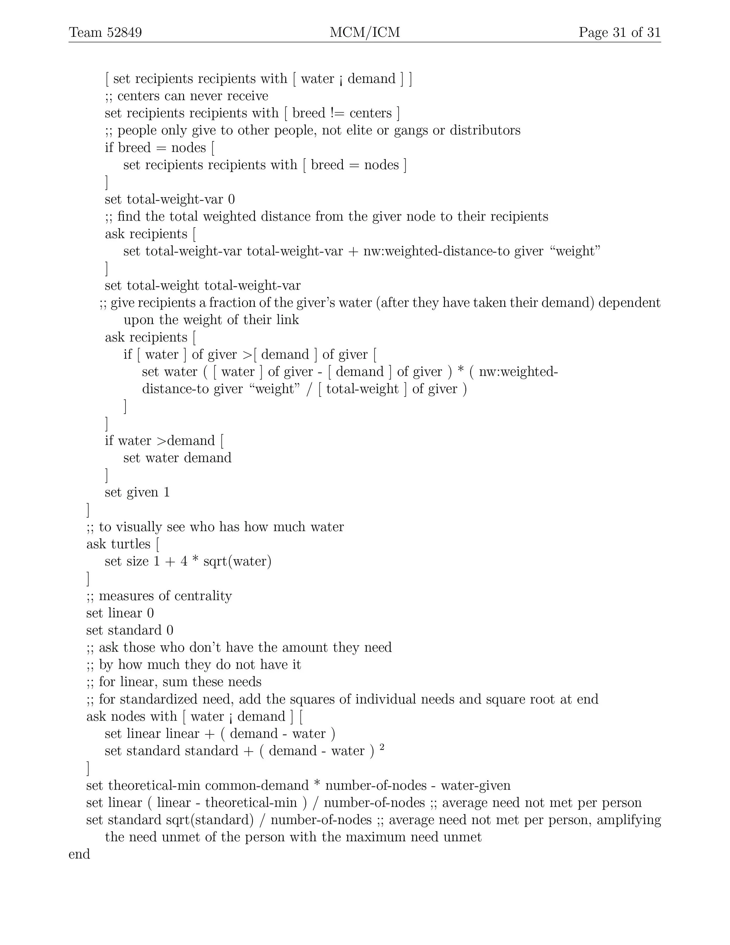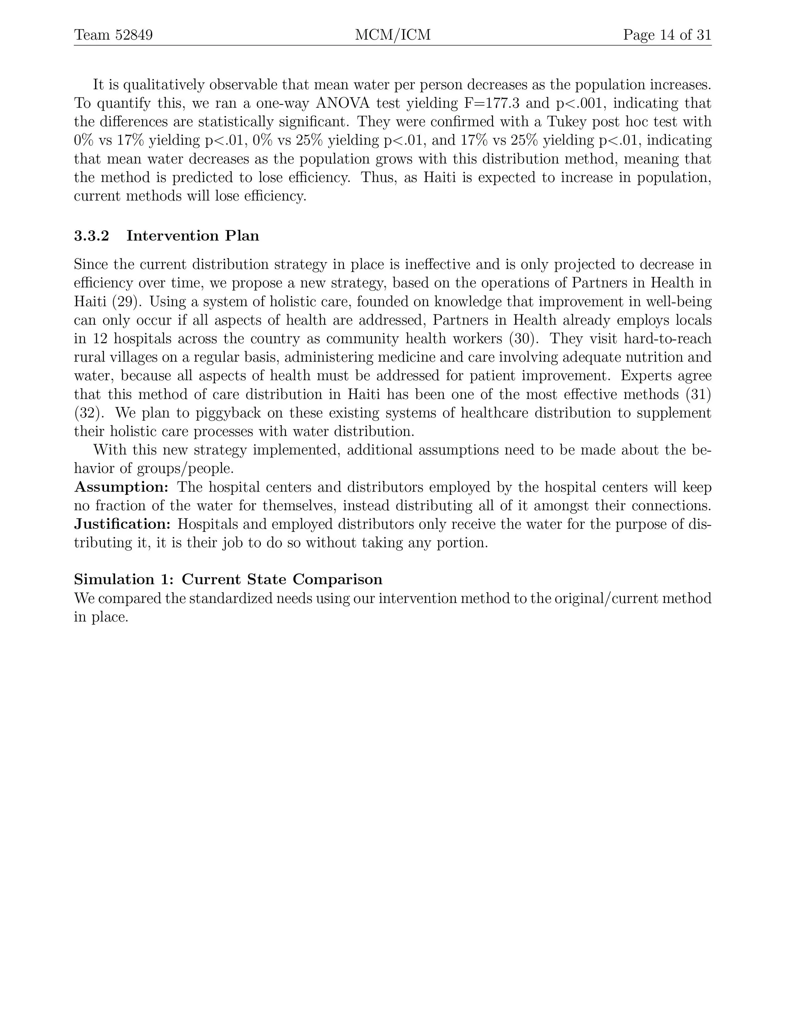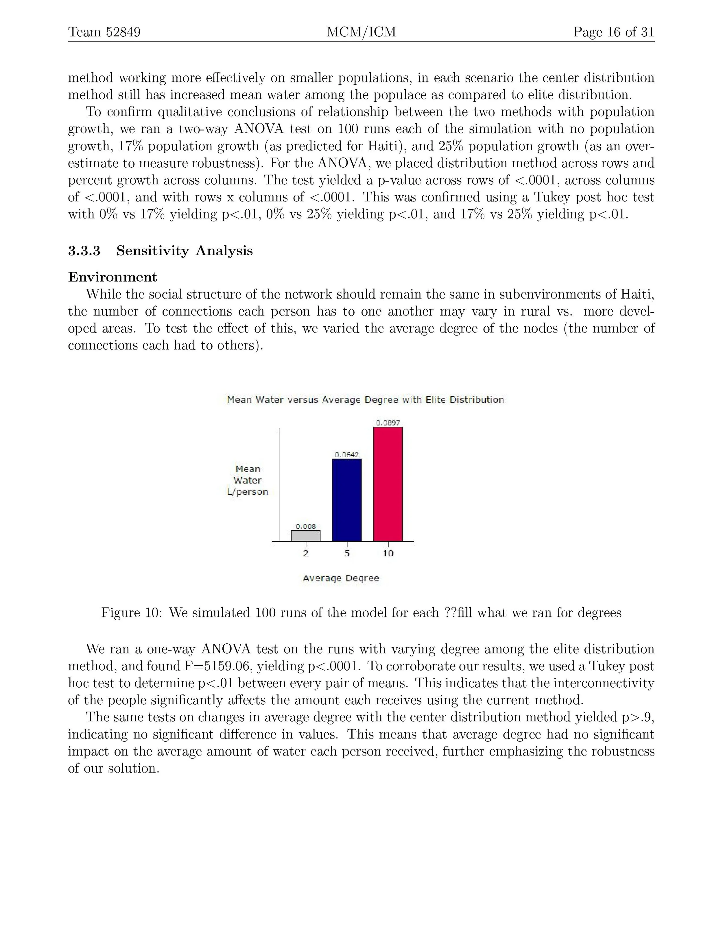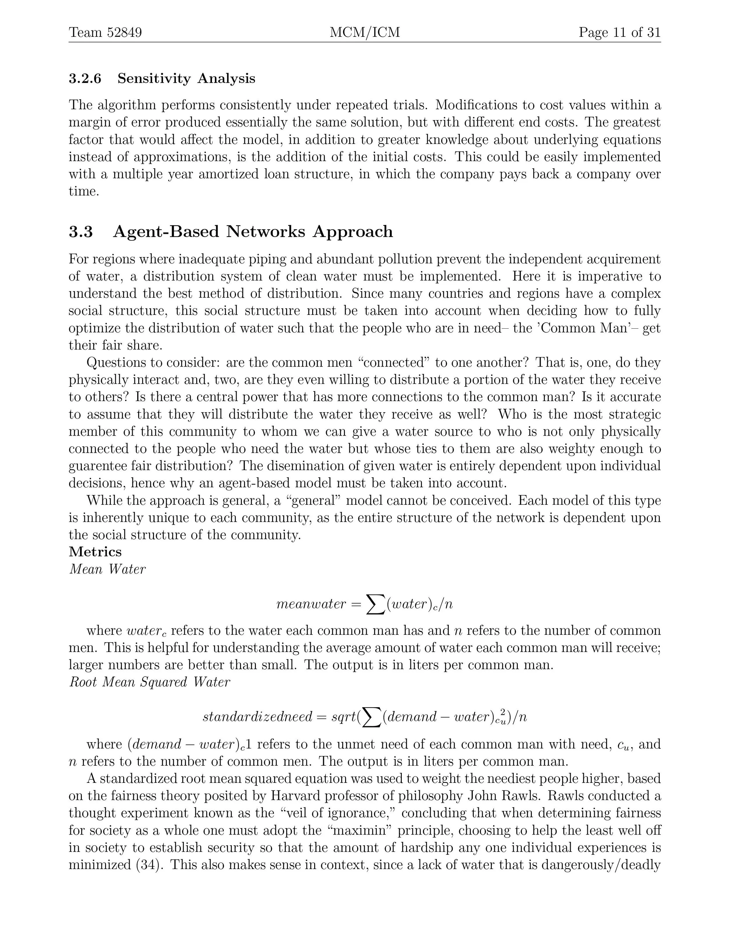 The Outstanding submission by the North Carolina School of Mathematics and Sciences was unlike any other seen by the judges this year. Instead of treating each task as a separate requirement, this team treats the overall problem of water scarcity as a project. The judges appreciated their interesting and very well written submission as well as the effort they demonstrated in tackling the problem of water scarcity by developing three different models which could be applied globally and then demonstrating the model’s output, specifically using Haiti. The team begins their submission with a history of Haiti entitled “Rags to Riches,” as they explain how Haiti went from having it all to having the lowest access rates to improved water and sanitation. This upfront analysis is accompanied by common interventions currently seen in Haiti, analyzed according to the team’s developed metric for a country’s success in delivering needed water to their population. Their metric incorporates economic and environmental costs, as well as the ability to be self-sustainable and socially viable. In each step of their modeling process for all three models, the team motivates the analysis, demonstrates them mathematically, explains them fort he general case, then apply them specifically to Haiti, including detailed reasonable assumptions and justifications. This is followed by a sensitivity analysis. This approach is tremendous and was appreciated by the judges. For the first model, they develop a systems network model, demonstrated in Figure 2, which creates differential equations for each of the six main factors of their model. This characterizes water flow by taking into account different sources of water and all varied uses of water. From there, it is applied to Haiti to understand that both the physical and social infrastructure for transportation and dissemination of potable water need to be highlighted. The team then examines uniquely-tailored intervention strategies for Haiti. Their first effort was to determine an optimal solution to their initial general success metric through particle swarm optimization. Then, they utilized agent-based network modeling to determine the best method for implementing a clean-water distribution system, the most critical of their intervention strategies for Haiti. Finally, the team compared current invention strategies to their proposed innovative solution using both a short- and a long-term planning horizon. Specifically, in the discussion of water scarcity, the judges appreciated the understanding of the problem as a whole. The team looked into the cultural aspects and fairness of wealth and poverty when examining water scarcity and how solutions would be accepted within a society. When applied to Haiti, the team really understood the challenges of a water distribution network in such a nation. The judges appreciated the considerations of control of distribution nodes, presence of NGOs, infectious disease spread, the effectiveness of the government, and the operation of gangs. Overall, this was the most unique modeling the judges had seen, and the incorporation of such tailored innovative solutions was superior. The team from the North Carolina School of Mathematics and Sciences worked hard to convince us that they had good models that worked well for Haiti and could be applied globally.